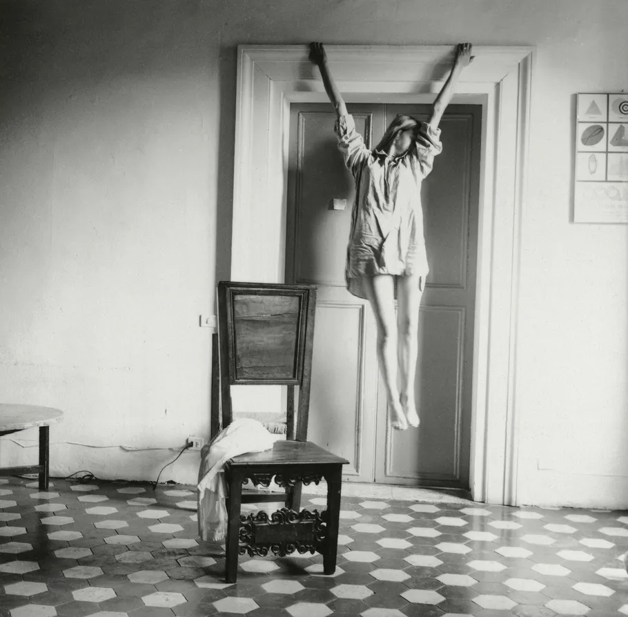 L’univers visuel de Francesca Woodman est immédiatement reconnaissable. Il se déploie dans des espaces souvent clos, intérieurs abandonnés, maisons délabrées, pièces nues aux murs fissurés, lieux chargés de mémoire et de silence. Ces décors ne sont jamais de simples arrière-plans. Ils dialoguent avec le corps, l’absorbent, le fragmentent ou le prolongent. Le corps féminin, le plus souvent le sien, apparaît flou, tronqué, dissimulé derrière un mur, un meuble ou un pan de papier peint. Ce flou n’est pas un accident technique mais un choix esthétique assumé, qui introduit la durée dans l’image et fait du mouvement un élément constitutif de la photographie. Woodman travaille avec la pose longue, avec la répétition, avec la disparition progressive du sujet, comme si l’image enregistrait une lutte entre apparition et effacement. Le corps devient instable, presque spectral, à la frontière entre l’être et le décor. Cette fusion avec l’espace renvoie autant à une recherche identitaire qu’à une réflexion sur la photographie elle-même, sur sa capacité à fixer le réel ou au contraire à en révéler l’instabilité. Les références à l’histoire de l’art sont nombreuses et discrètes. On y perçoit l’influence du surréalisme, de la peinture symboliste, de la statuaire antique, mais aussi des pratiques conceptuelles des années 1970. Les miroirs, les fenêtres, les angles obliques et les jeux de cadres internes renforcent cette impression de mise en abyme permanente. L’image semble toujours se regarder elle-même, consciente de sa construction et de ses limites.